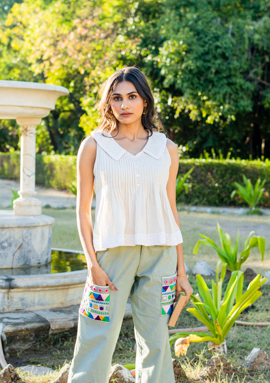 Women Cream-Coloured Keyhole Neck Empire Crop Top