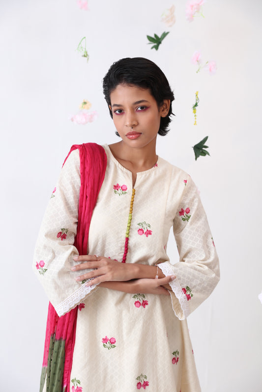 Embroidered Off-White Kurta and White Pant (Set of 2)