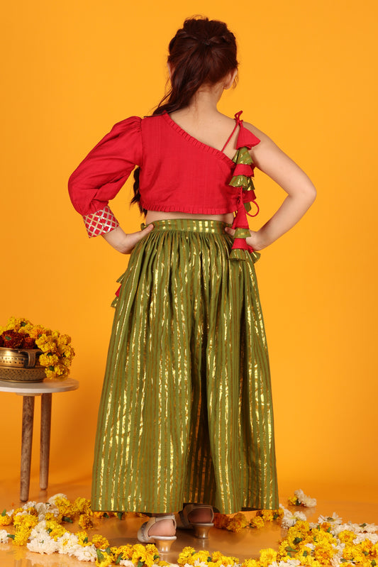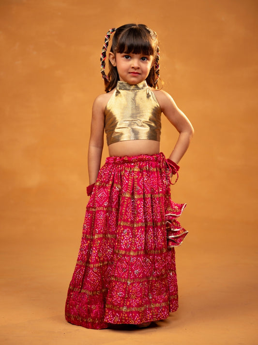Golden Crop Top with Chinon Crushed Pink Lehenga (Set of 2)