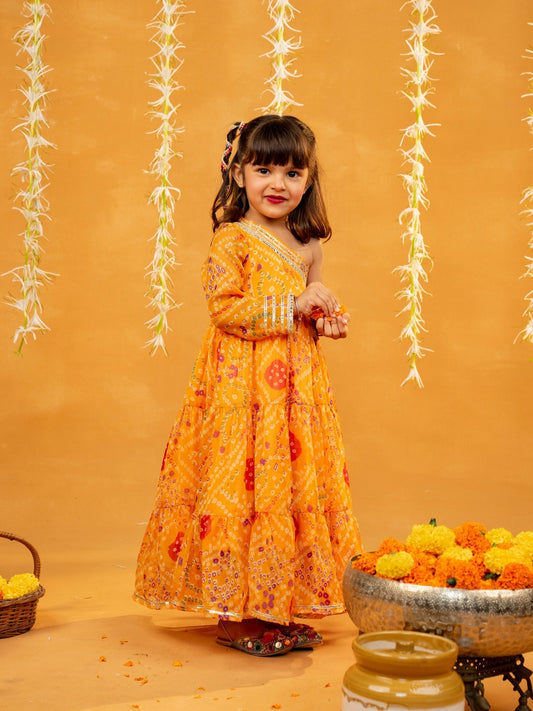 Yellow Bandhni Printed Gathered One Shoulder Full Sleeve Dress