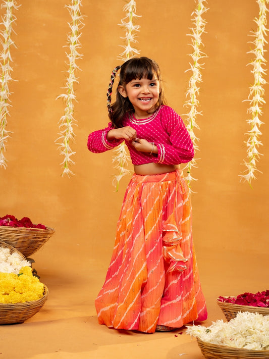Pink Laheriya Printed Georgette Top with Georgette Crushed Multicoloured Lehenga (Set of 2)