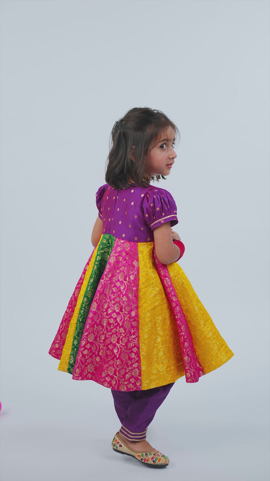 Multicoloured Banarasi Anarkali Kurta and Purple Pant with Yellow Dupatta (Set of 3)