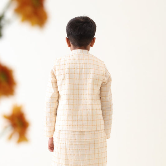 Boys Cotton Lurex Hand Embroidered Ice-cream Jacket with Cotton Golden Stripes Kurta And Pant