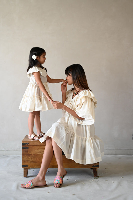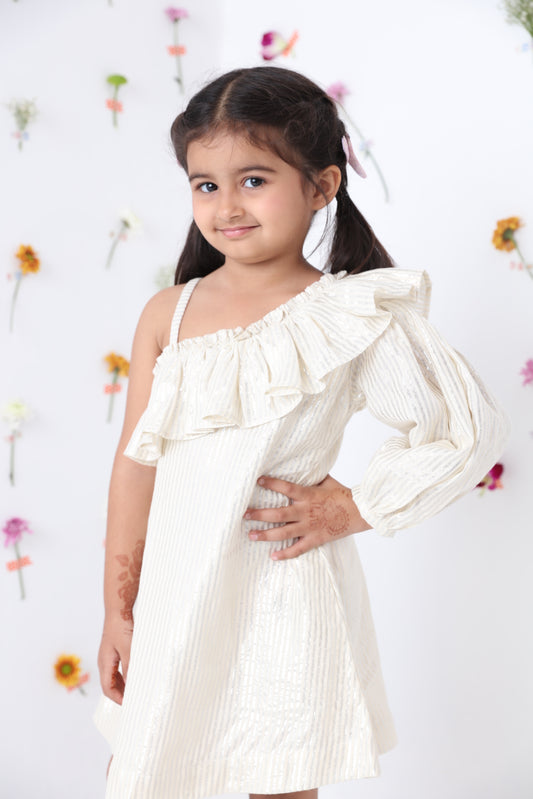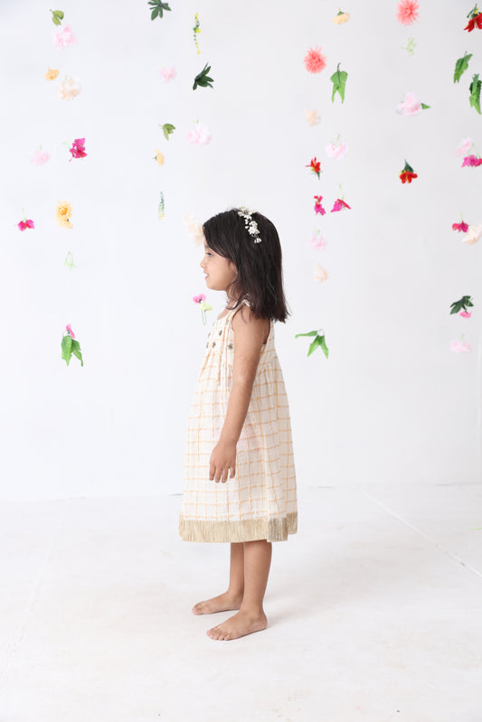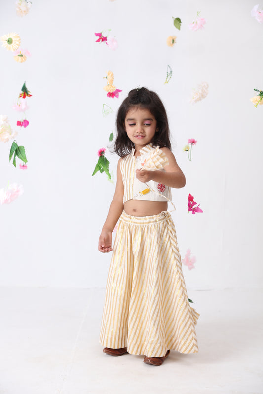 Girls Off-white Cotton Golden Lurex Handworked Lehenga Set