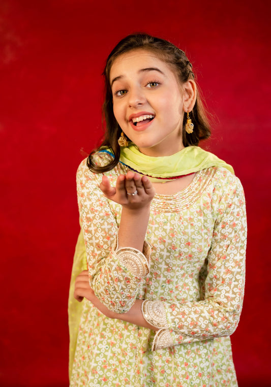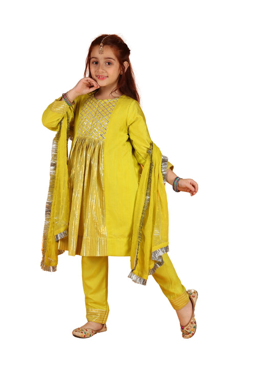 Jilmil Girls Anarkali Neon Yellow Silk Dress with Pant & Dupatta (set of 3)