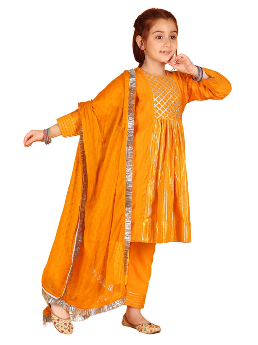 Jilmil Girls Anarkali Neon Orange Silk Dress with Pant & Dupatta (set of 3)