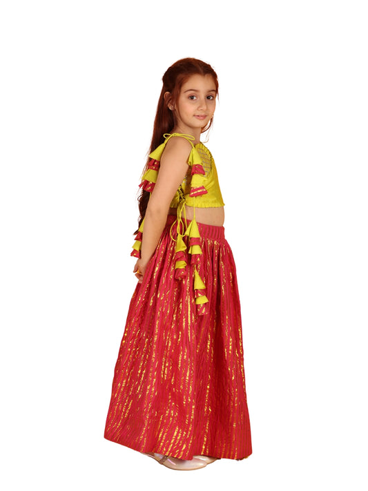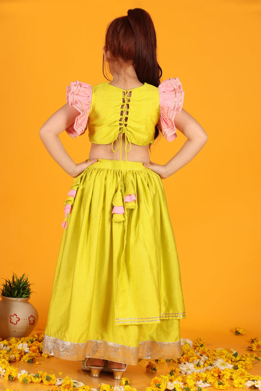 Jilmil Girls Gota Work Neon Yellow Top And Elegant Tassels Embellished Flared Lehenga (set of 2)