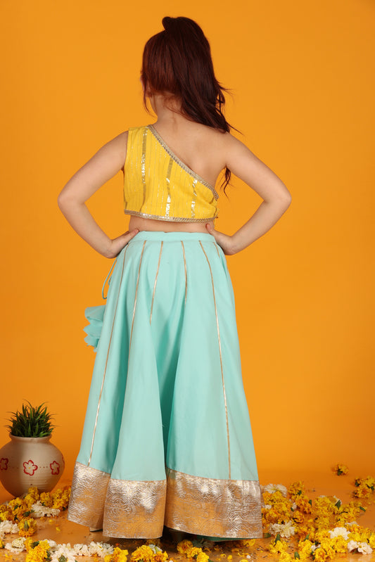 Jilmil Girls one shoulder yellow emblished blouse with Blue lehenga (set of 2)