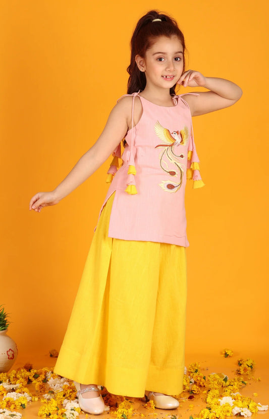 Jilmil Girls Phoenix Embroidered Pink Cotton Kurta with Yellow Sharara (set of 2)