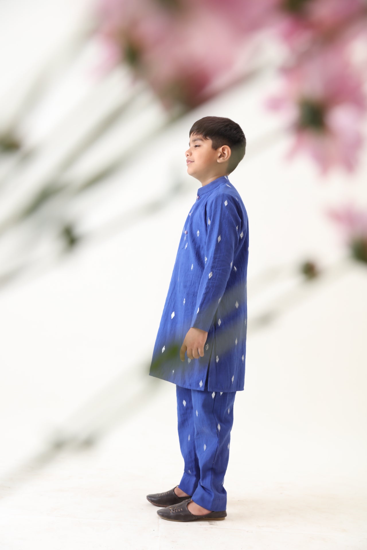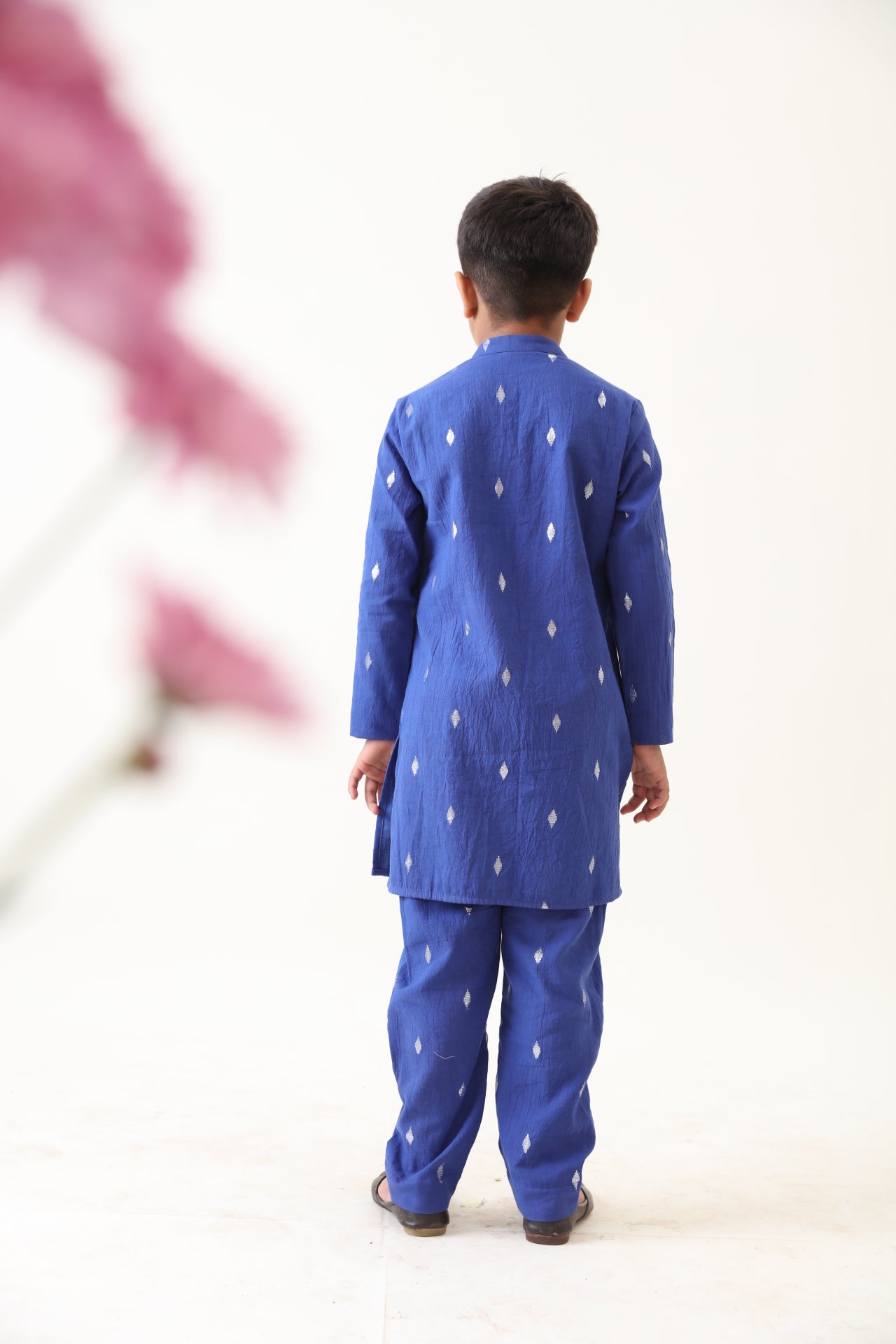 This Blue Kurta is made from cotton lurex and has button fastening on the front with full sleeves, along with the same pant.