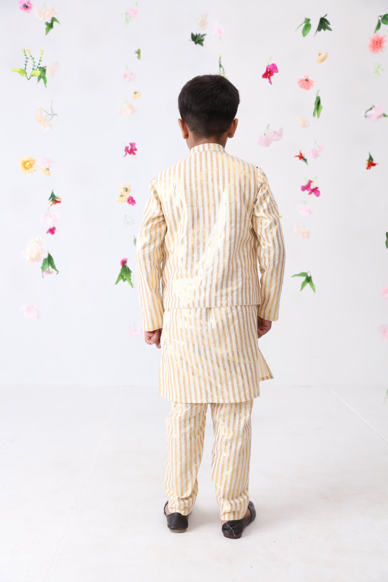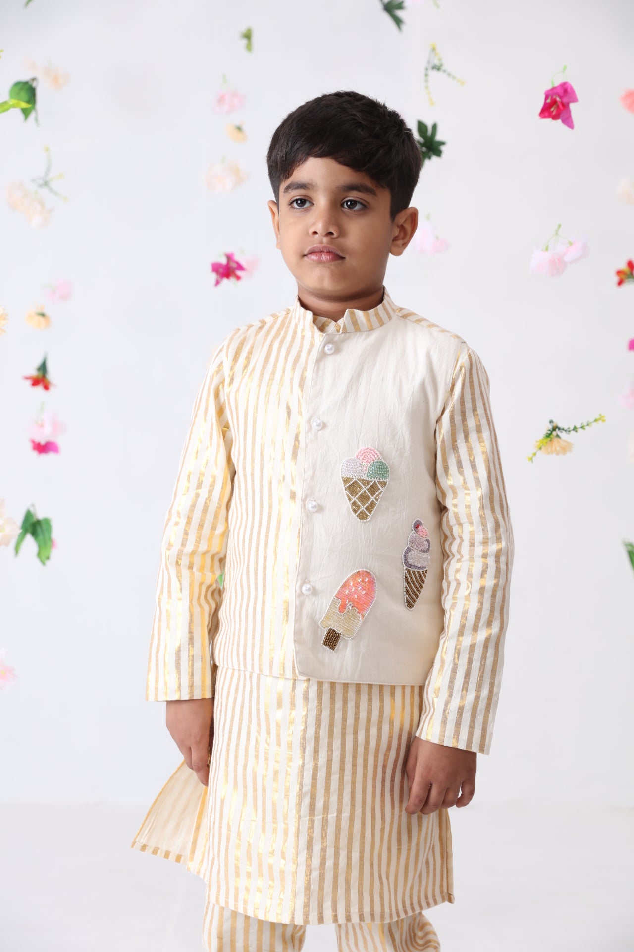 Boys Cotton Lurex Hand Embroidered Ice-cream Jacket with Cotton Golden Stripes Kurta And Pant
