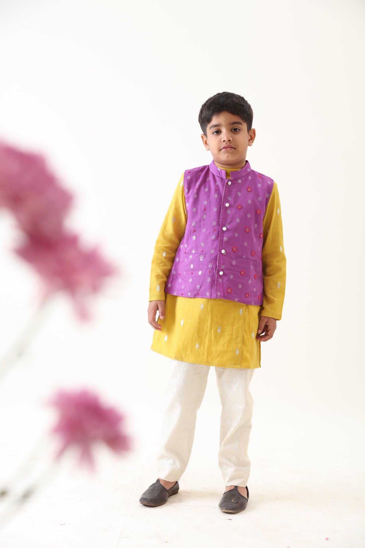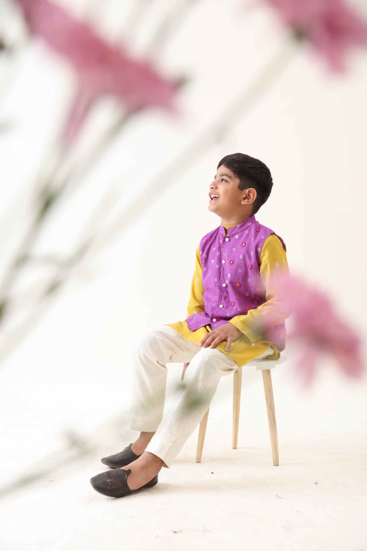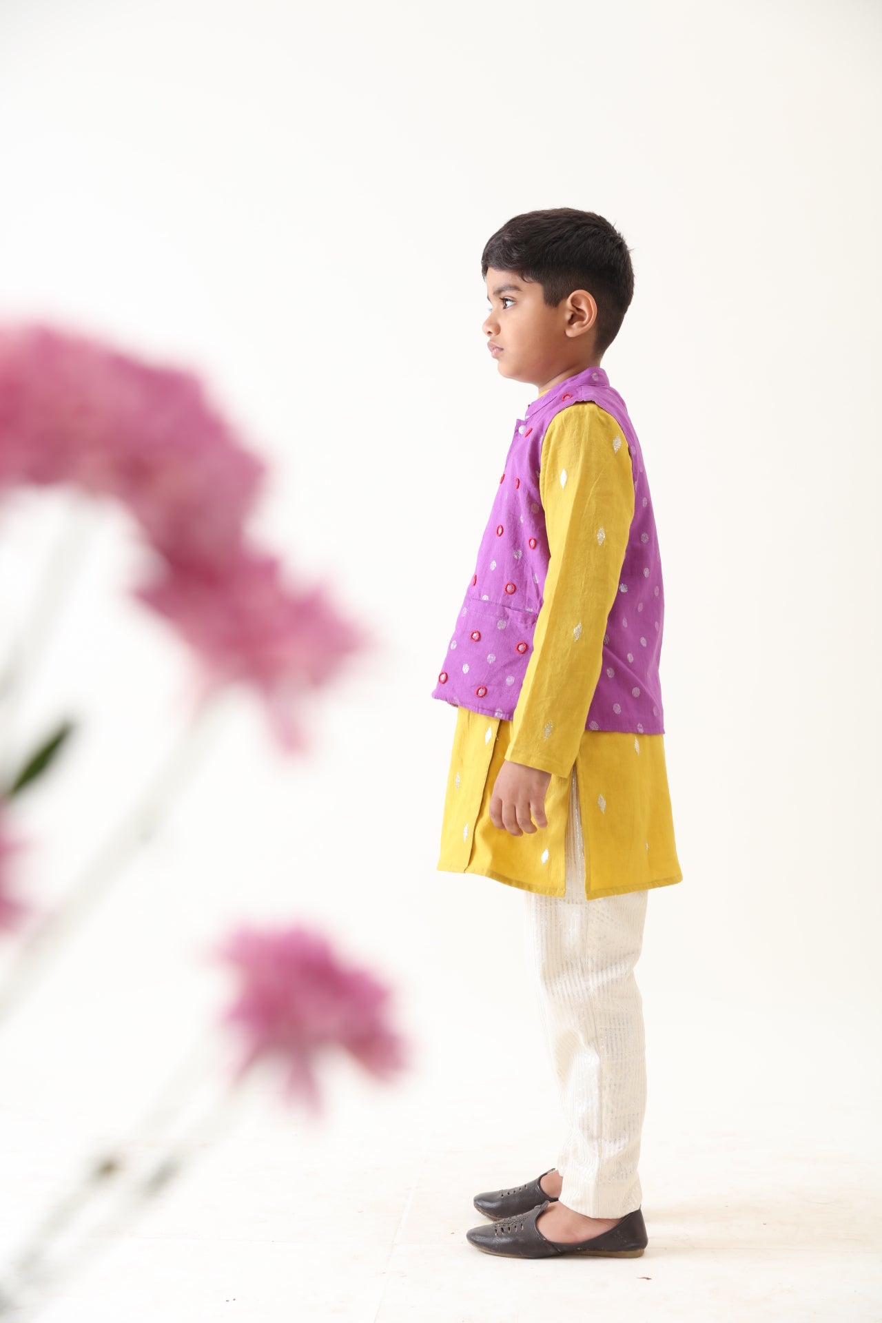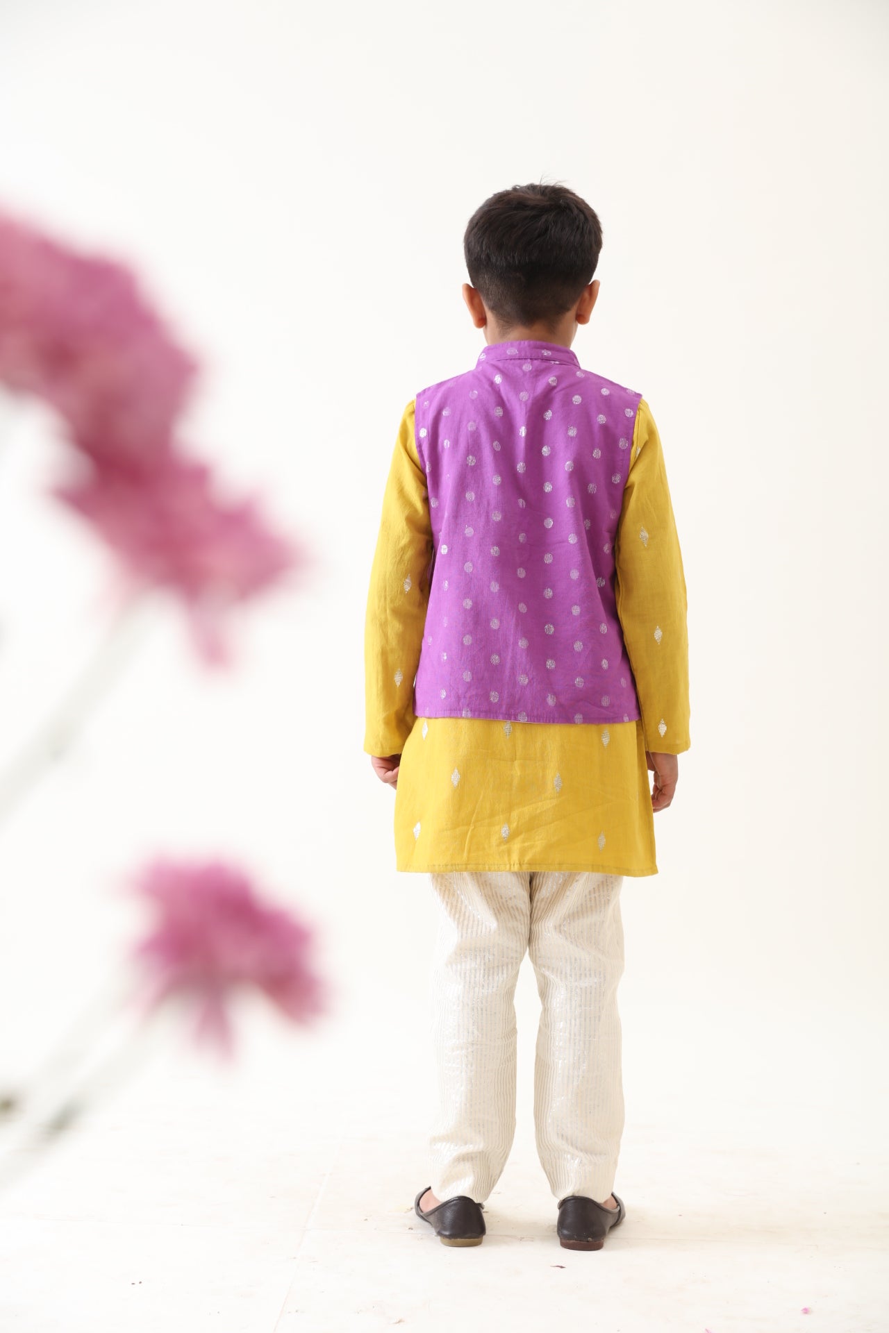 Boys Cotton Lurex Purple Bead Work Jacket With Yellow Kurta And Silver Striped Pant (Set of 3)
