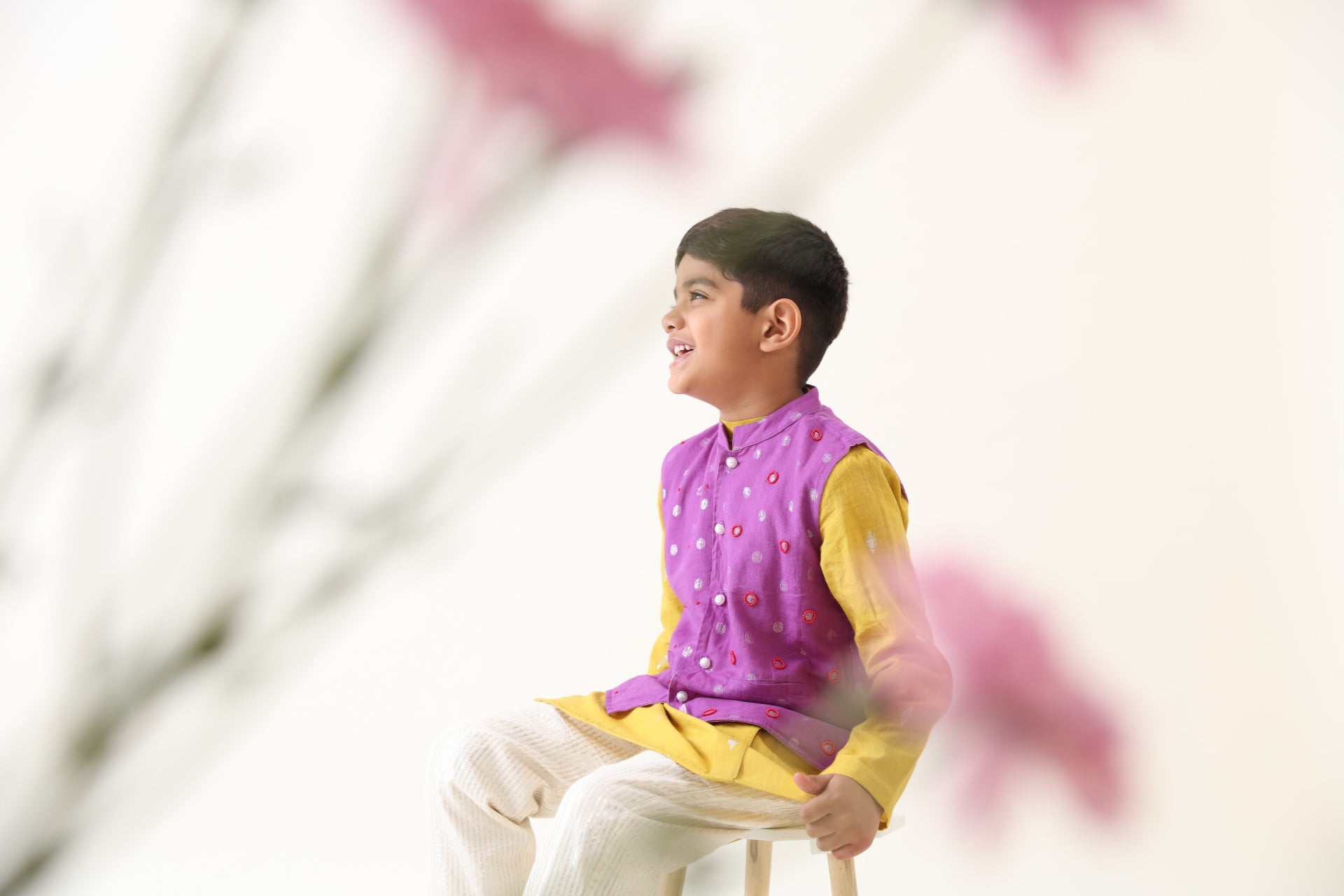 This set contains a Purple cotton lurex Nehru jacket with red beadwork on the front side, along with a yellow kurta and white pants.