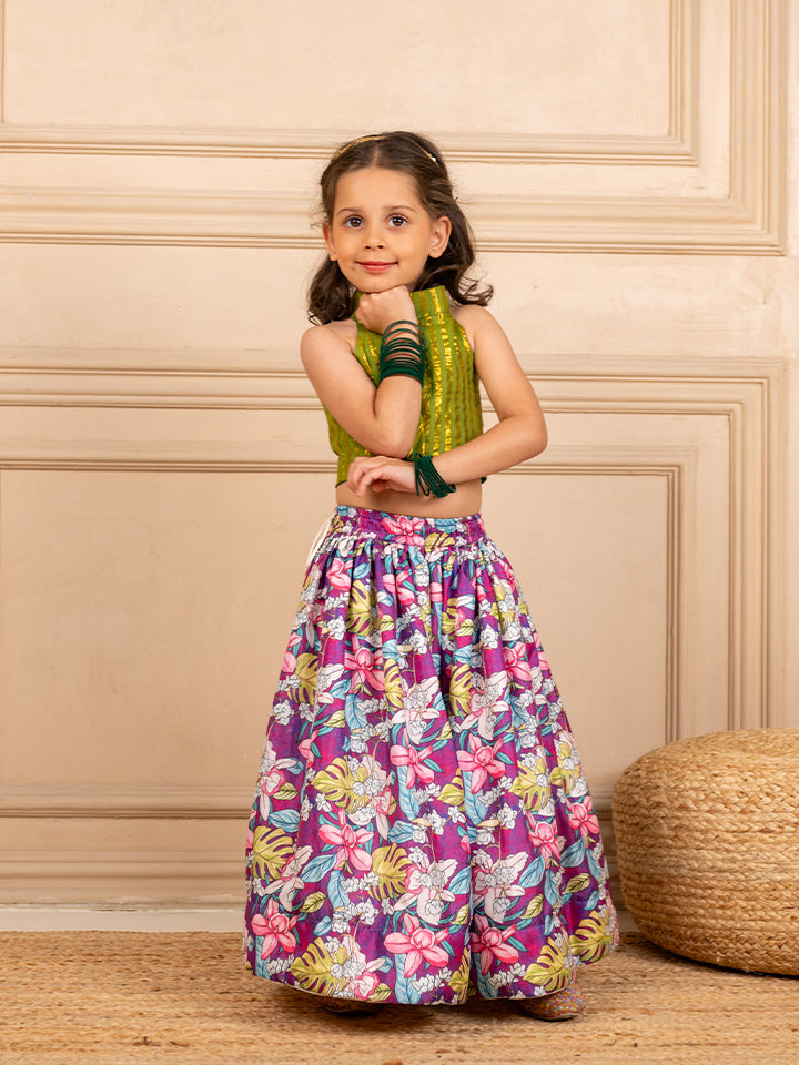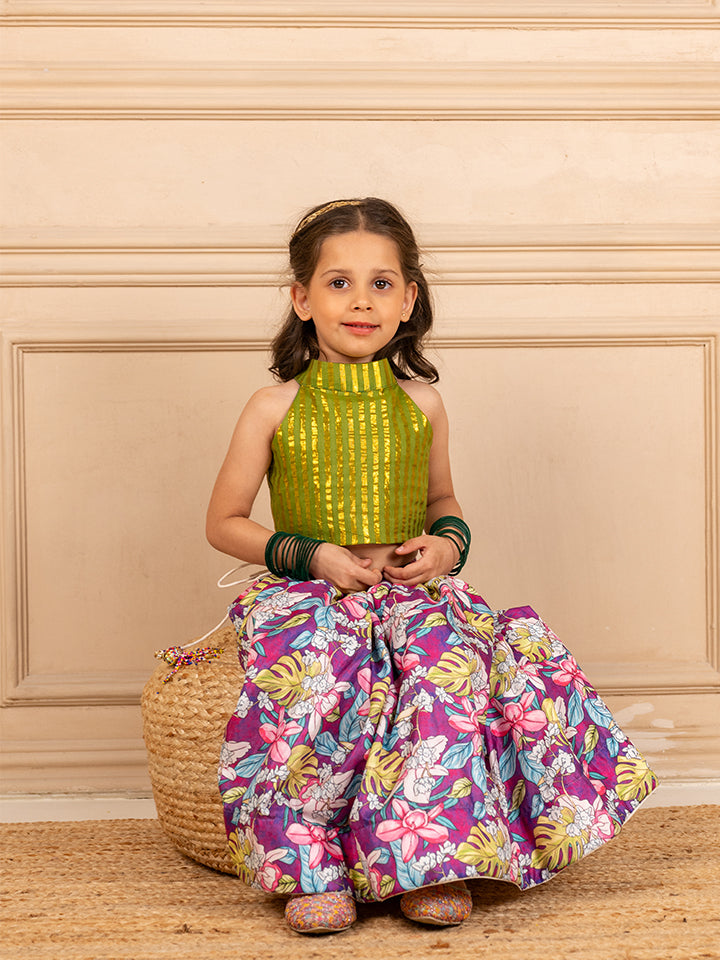 Girls Green Lurex Sleeveless Top and Roman Printed Lehenga (Set of 2)