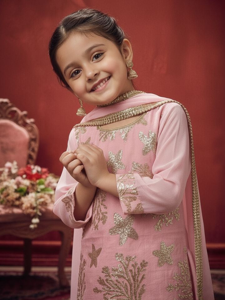 Dress your little one in timeless elegance with this girls light pink cotton salwar kurti set. Comes with a matching dupatta to complete the traditional ethnic look. Crafted in soft, breathable cotton for day-long comfort and ease of movement. Perfect for festivals, school events, family gatherings and cultural celebrations.