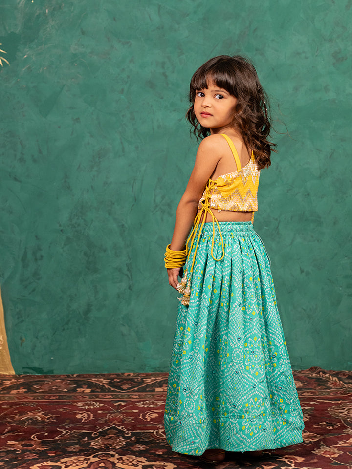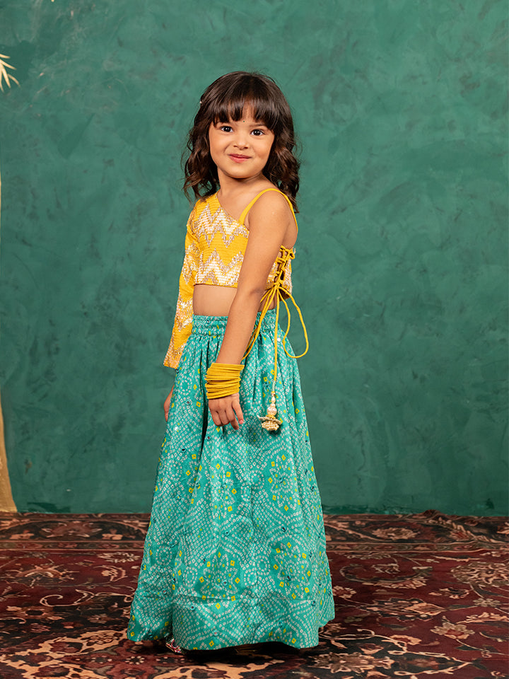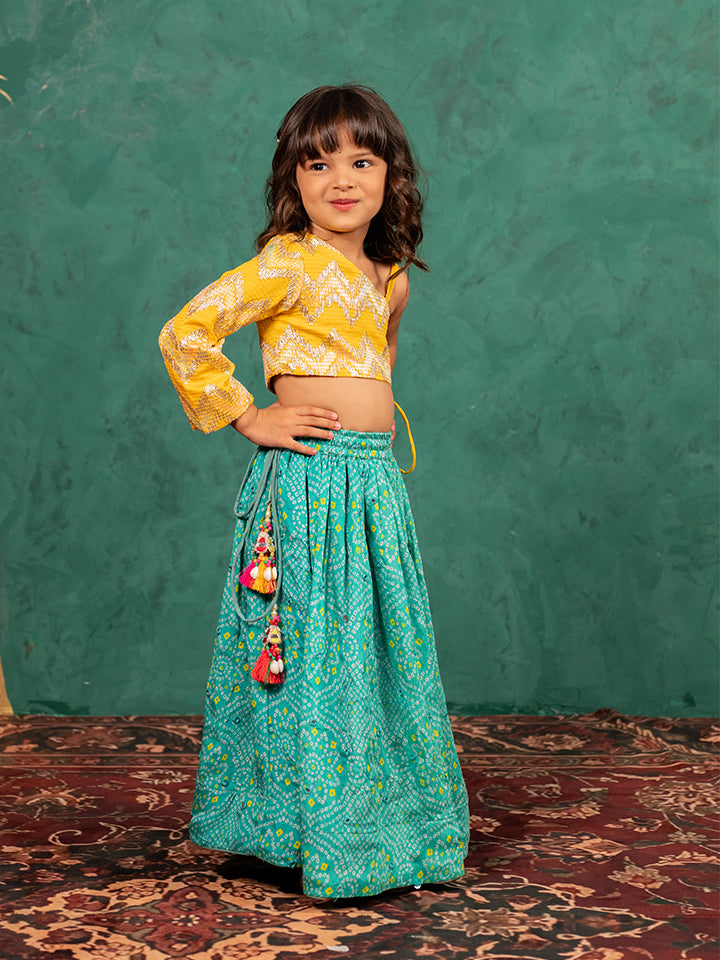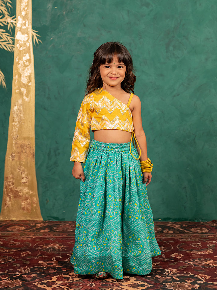 Girls One Shoulder Yellow Top with Bandhni Mirror Work Lehenga (Set of 2)