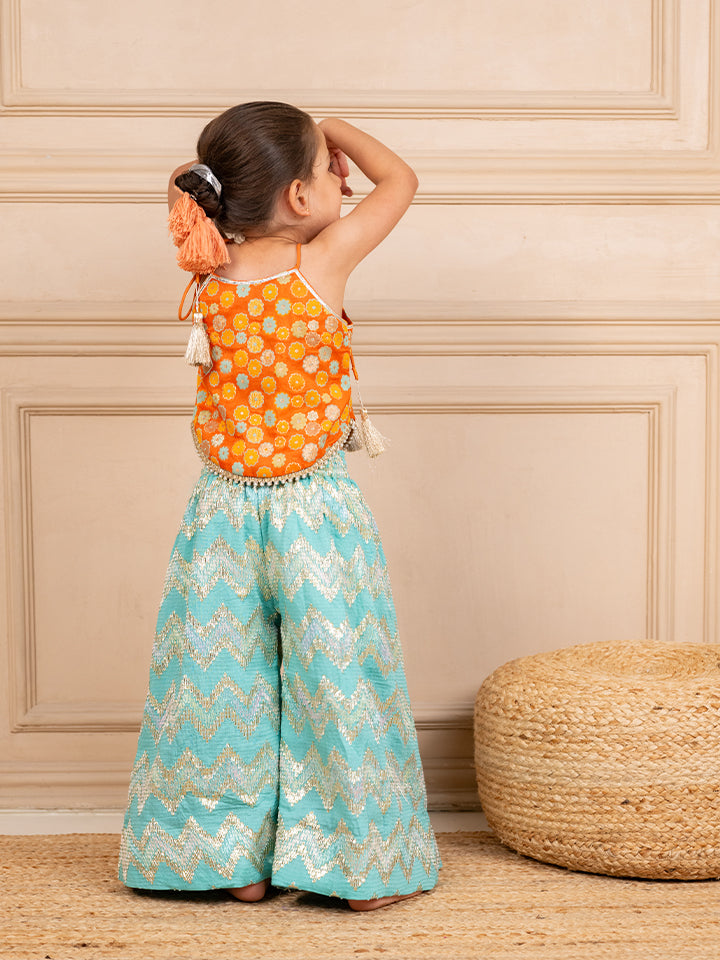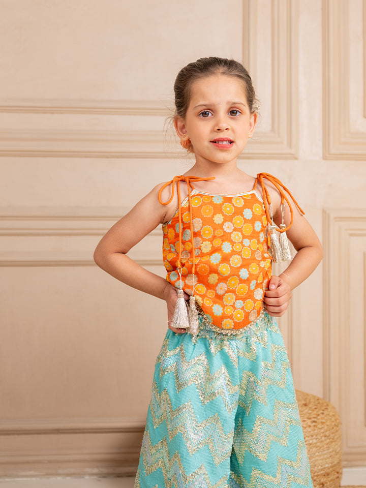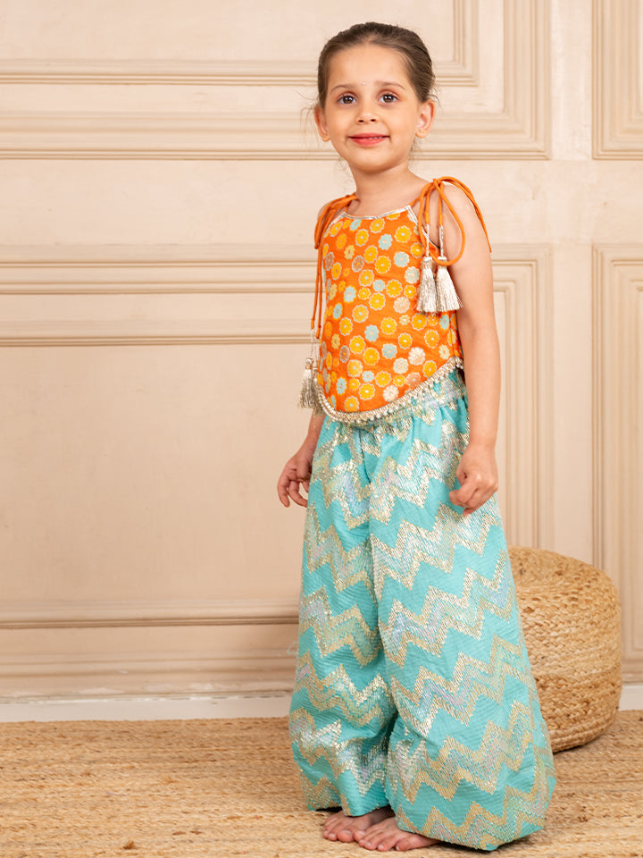Girls Orange Brocade Top and Ocean Blue Zig Zag embroidered Palazzo (Set of 2)