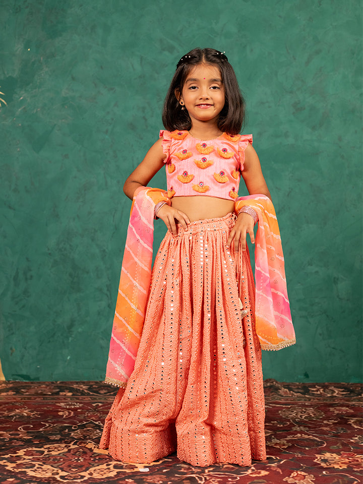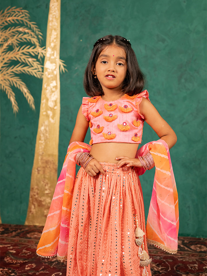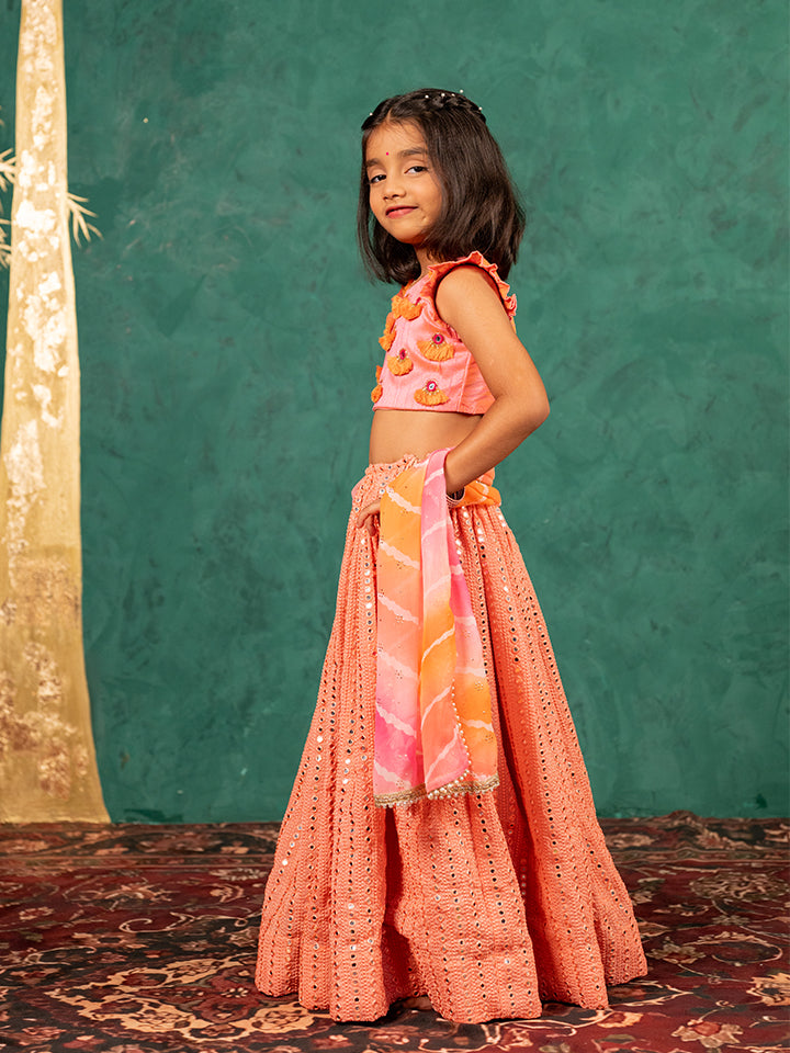 Girls Pink Salmon Coloured Mirror Handworked Top and Mirror Embroidered Georgette Lehenga with Dupatta (Set of 3)