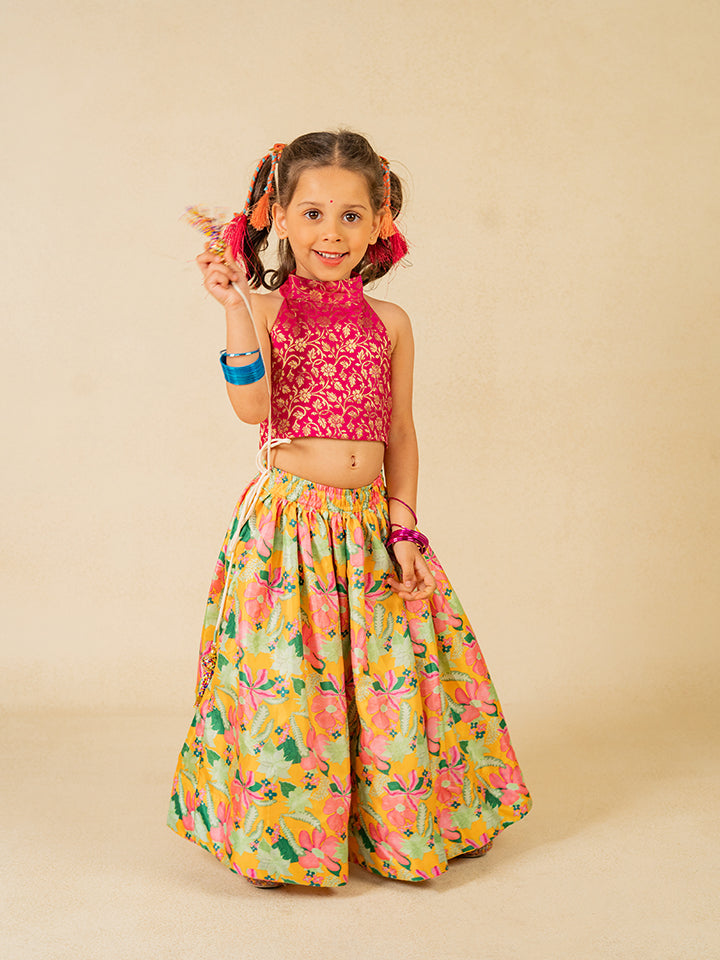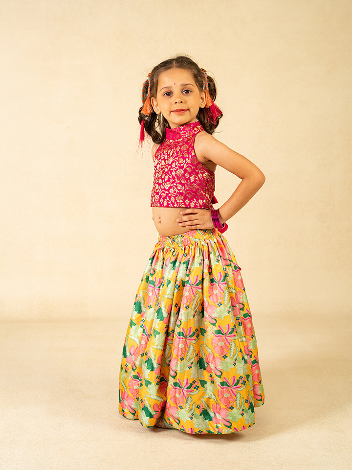 Girls Pink Sleeveless Top and Roman Printed Lehenga (Set of 2)