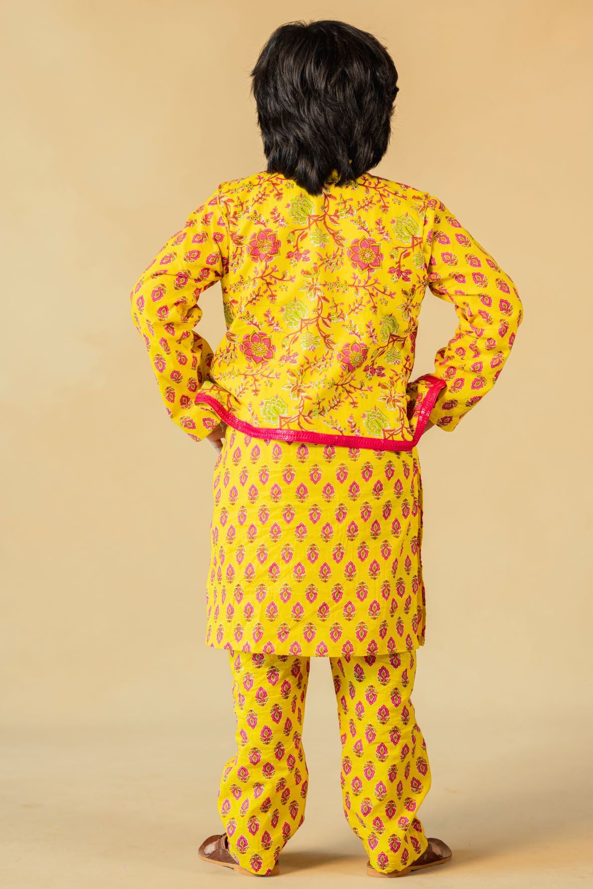 This Jaipuri Printed Cotton set includes, Jacket with sequence finishing and button fastening along with Kurta with full sleeves and button fastening on front closure & paired with matching pant.