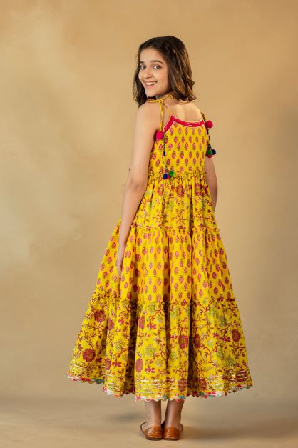 This Cotton Dress with Jaipuri print comes with sequence finishing on neck line, and linen for best comfort