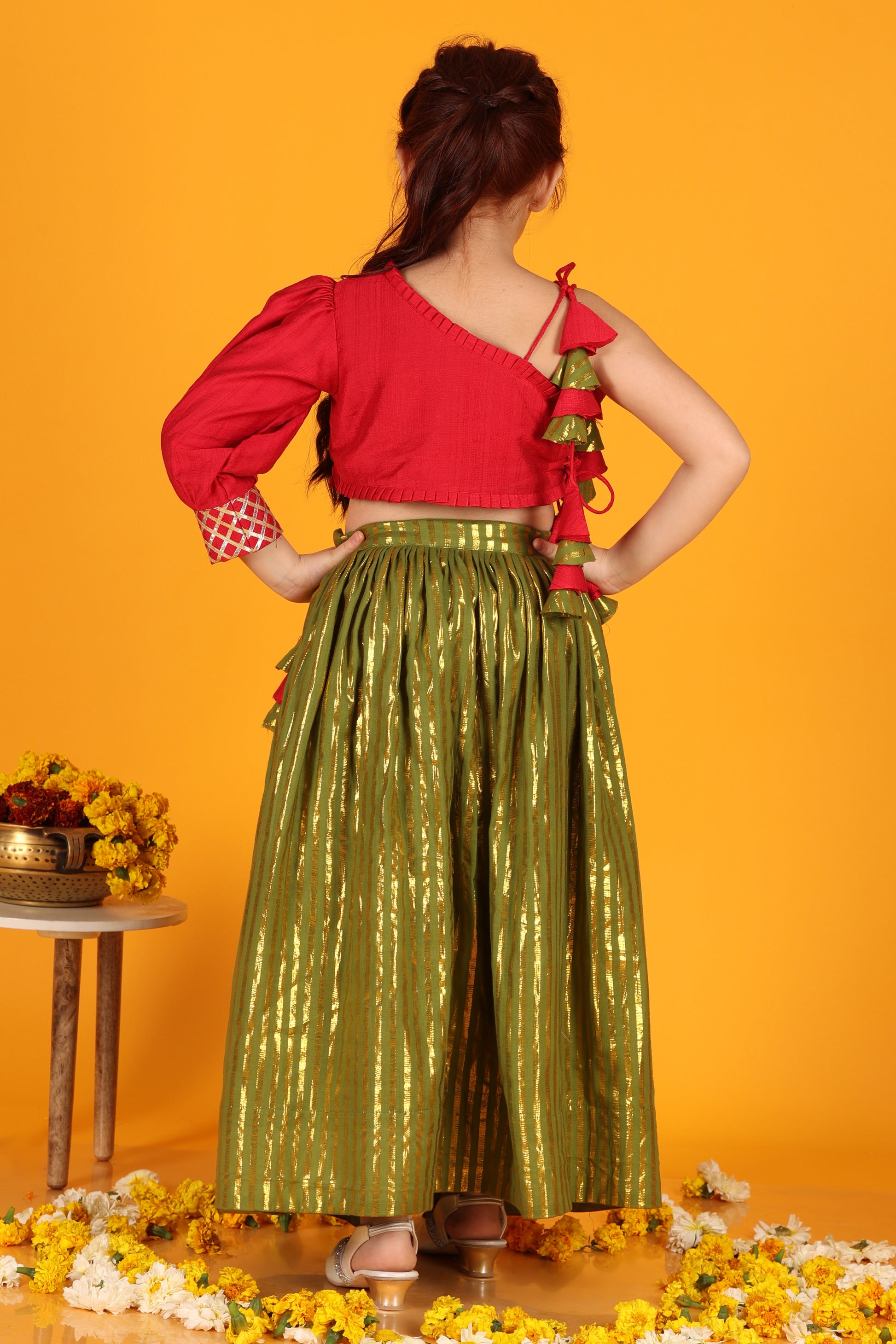 Elevate her style with the Jilmil Girls Gota Work Rani Pink Top paired with an Elegant Tassels Embellished Flared Lehenga. This enchanting ensemble exudes grace and charm, featuring a stunning rani pink top adorned with intricate gota work, adding a touch of cultural flair. Accompanied by a beautifully flared lehenga embellished with elegant tassels, it creates a perfect blend of tradition and contemporary elegance. Ideal for special occasions or festive celebrations, this ensemble is sure to captivate with its exquisite craftsmanship and vibrant colors, making every girl feel like a princess