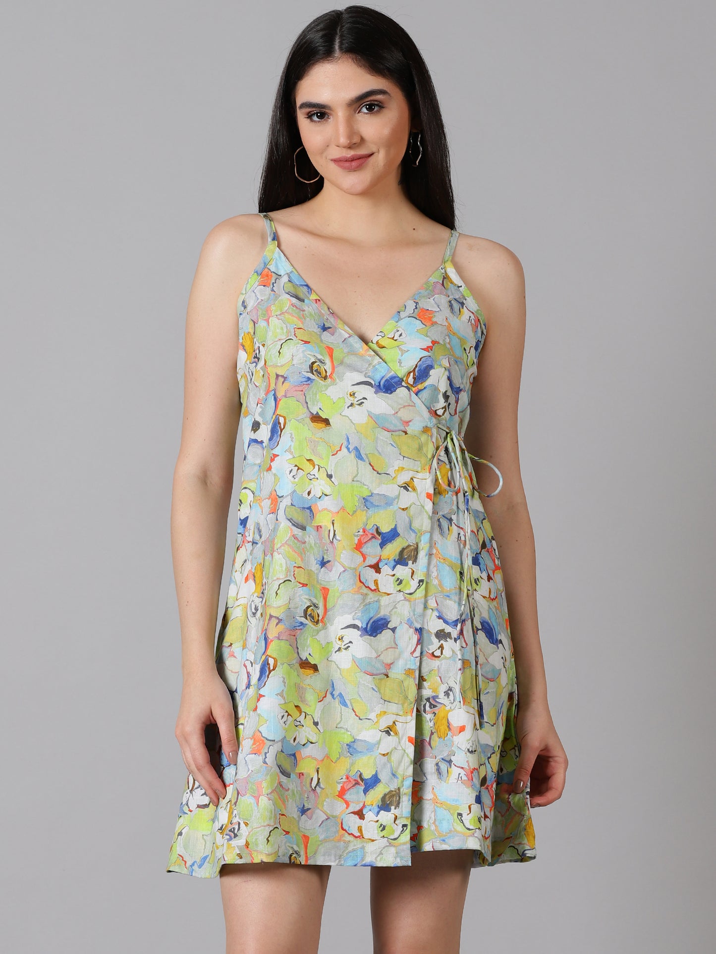 An elegant wrap dress in our soft handwoven linen finished with a pop coloured print, spaghetti sleeves and mini length. this dress comes with linen attached.