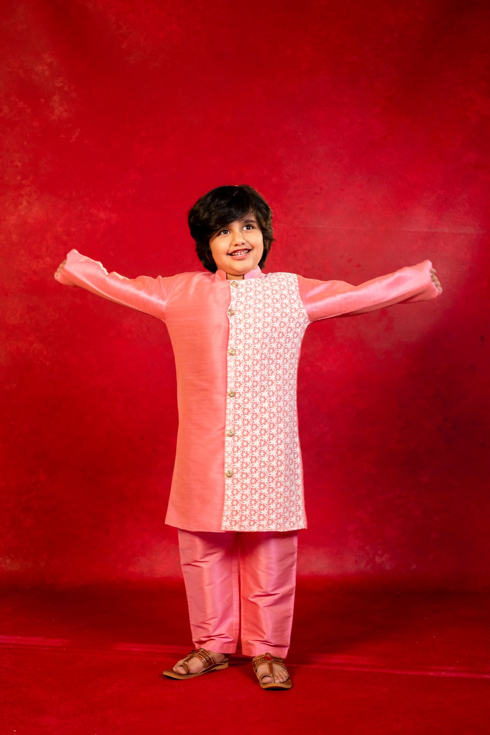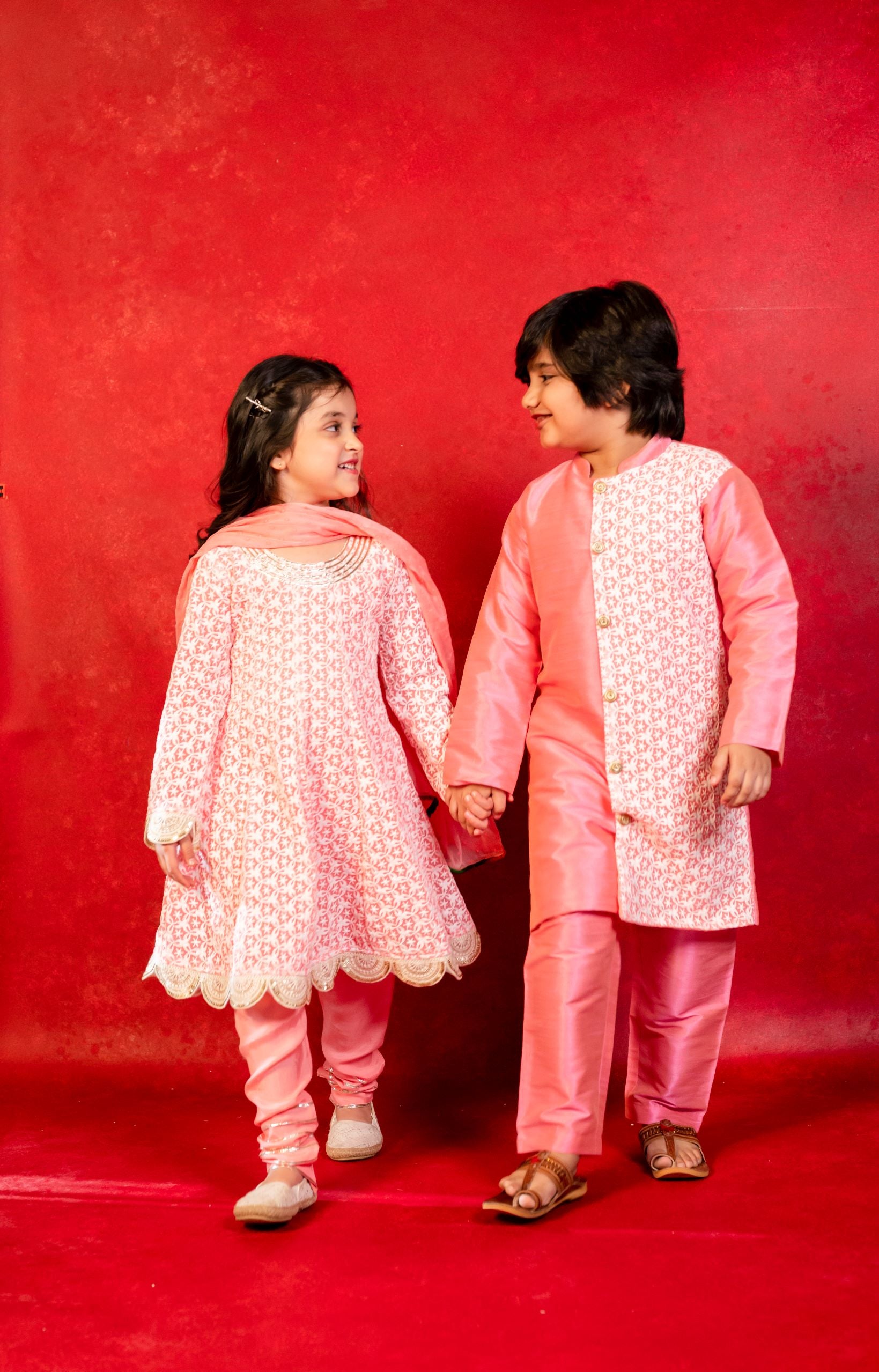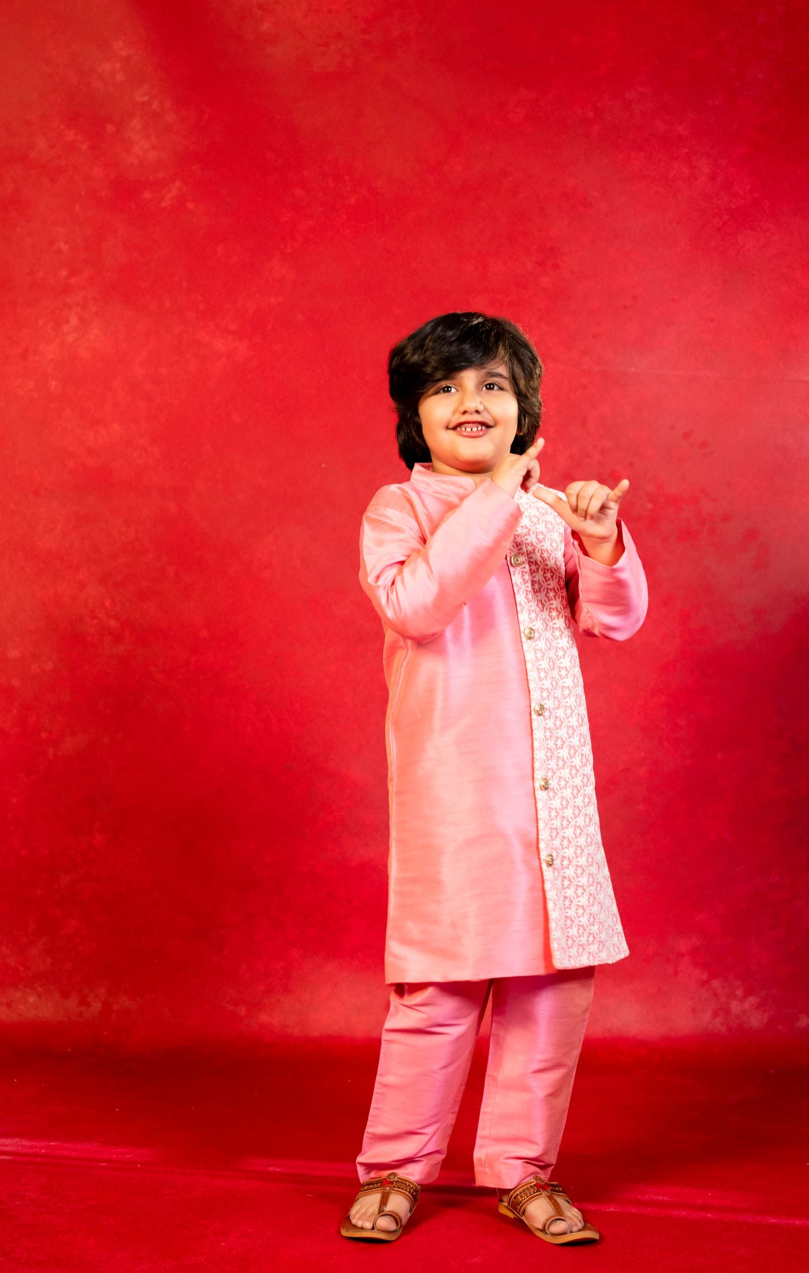 This Baby Pink Outfit for your little one with silk fabric with minimal printed Chikankari. This set includes Kurta & Pant. Finished with linen for your kid's comfort.