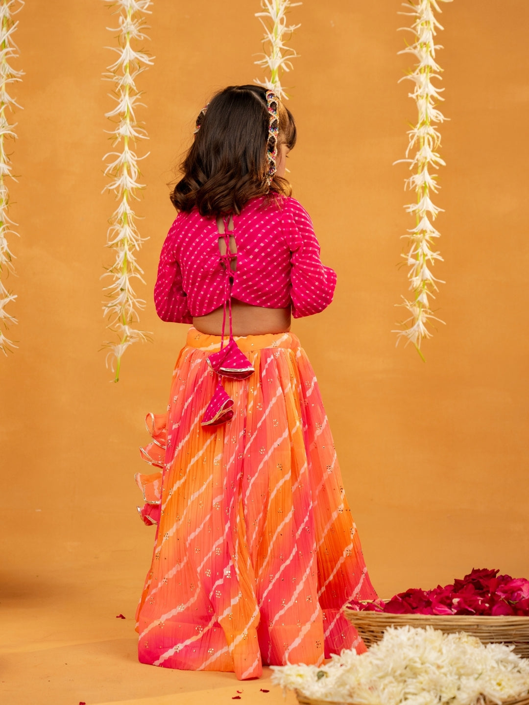Pink Laheriya Printed Georgette Top with Georgette Crushed Multicoloured Lehenga (Set of 2)